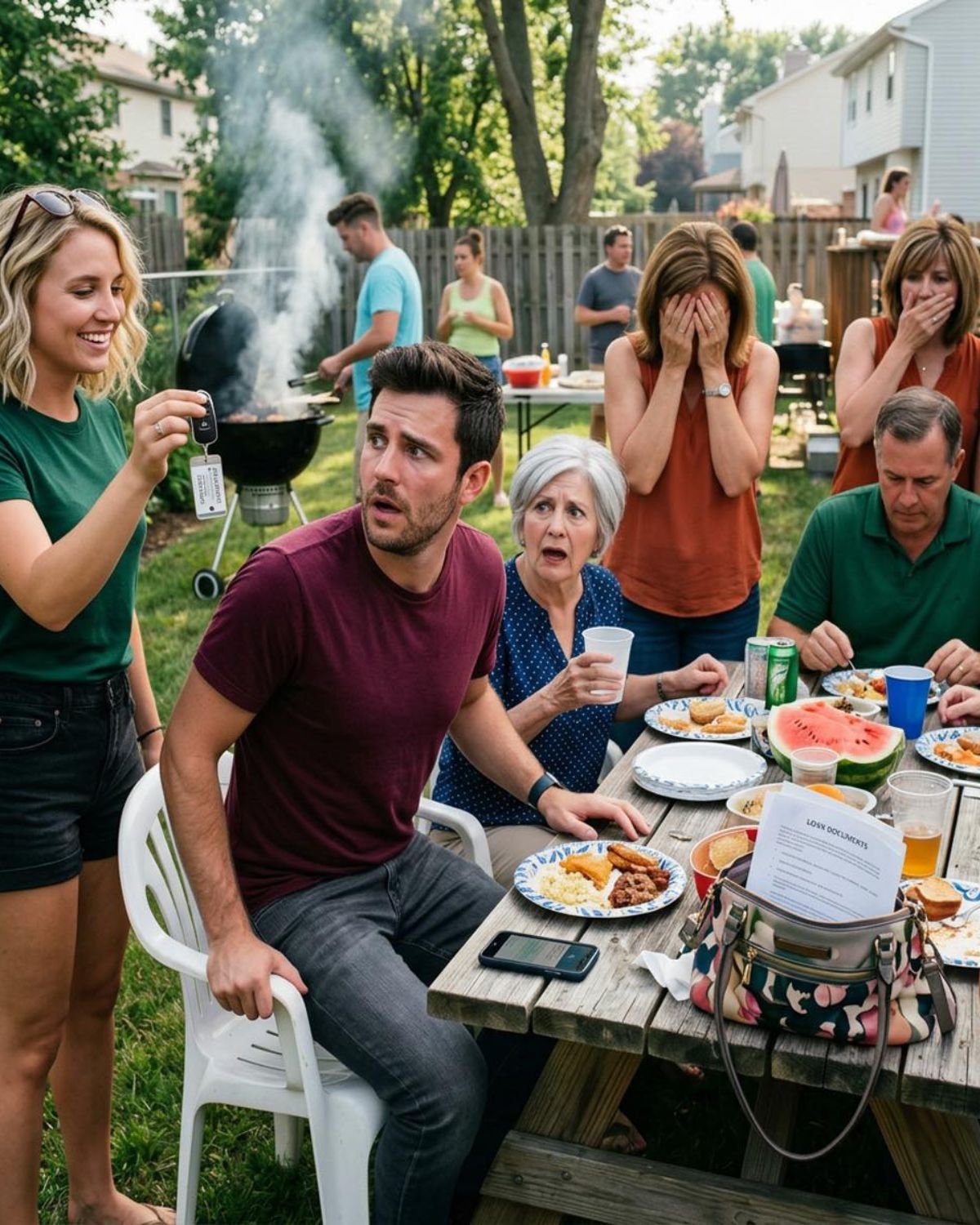 Mi madre dejó de cortar la sandía. Mi padre se quedó mirando su plato. Mi primo Daniel, que bromeaba incluso en funerales y rupturas, de repente encontró el césped fascinante. Y justo entonces, como si todo hubiera sido cronometrado por una broma cruel, Chloe entró por la puerta trasera levantando un mando de llaves nuevo con un lazo rojo atado.