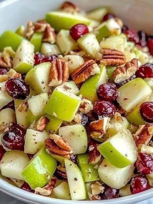 Esta ensalada de manzana es una armoniosa mezcla de crujientes manzanas Honeycrisp, apio crujiente, uvas jugosas, nueces pecanas tostadas y arándanos rojos secos dulces. Aderezada con un aderezo cremoso y ligeramente dulce, es perfecta como guarnición o almuerzo ligero.