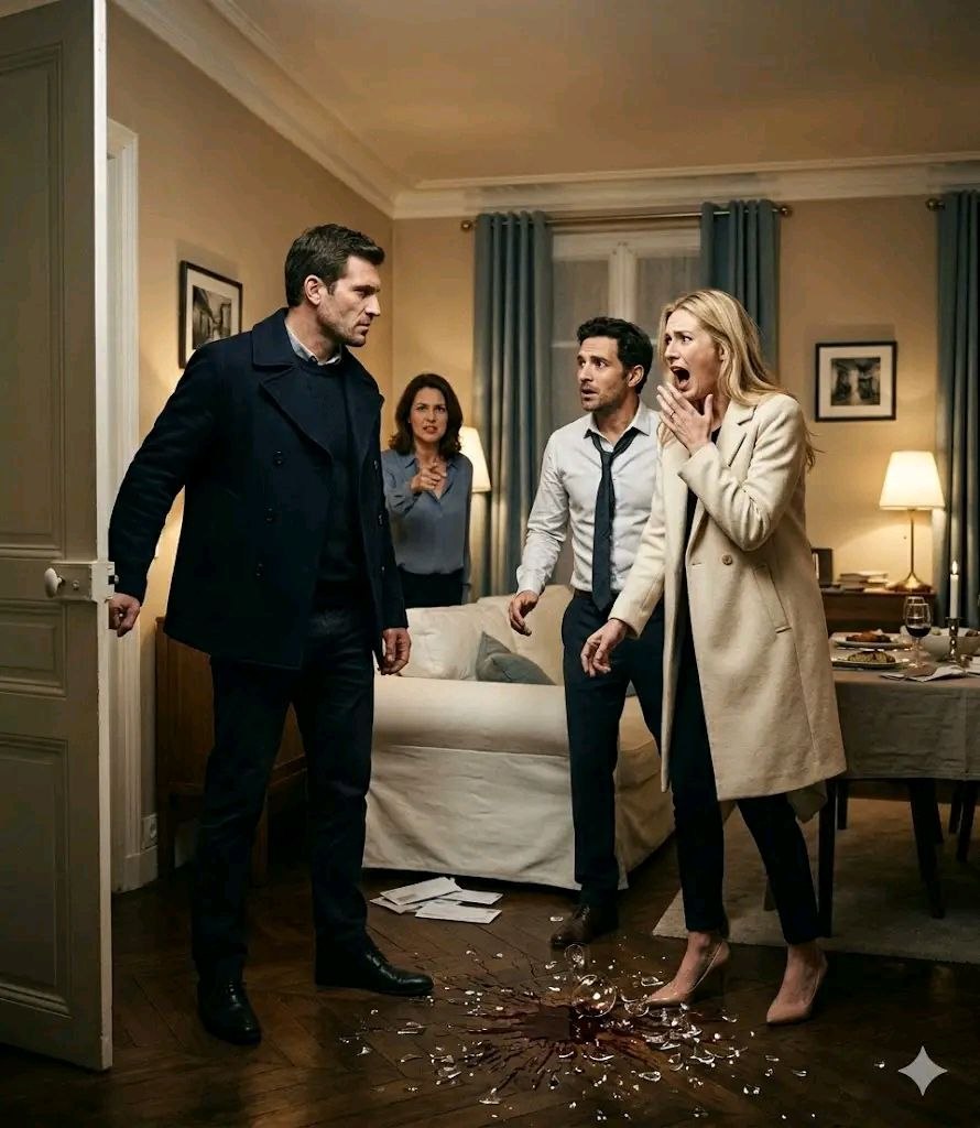 El hombre que estaba en la entrada era alto, de hombros anchos, vestía un abrigo marinero azul marino y parecía alguien que ya sabía que esto iba a terminar mal. Entró y, antes de que pudiera decir nada, Madison se dio la vuelta, lo vio, se puso furiosa, dejó caer su copa de vino al suelo y gritó: