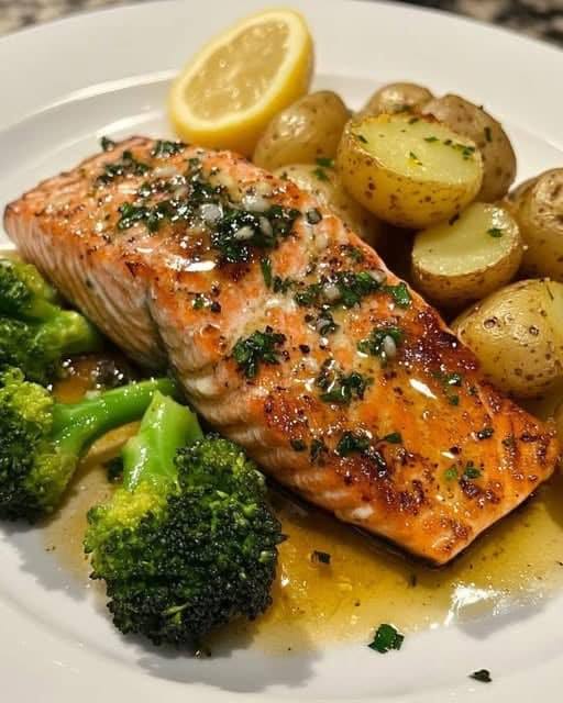 Salmón con Mantequilla de Limón, Papas Crujientes y Brócoli: Una Combinación Saludable y Deliciosa