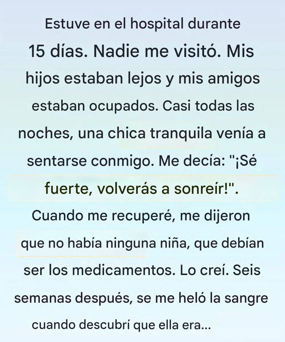 Nunca se presentó ni explicó por qué había venido. Simplemente acercó una silla a mi cama y se sentó con las manos cruzadas, como si perteneciera a ese lugar. No podía hablar ni preguntar nada, pero de alguna manera me entendió.